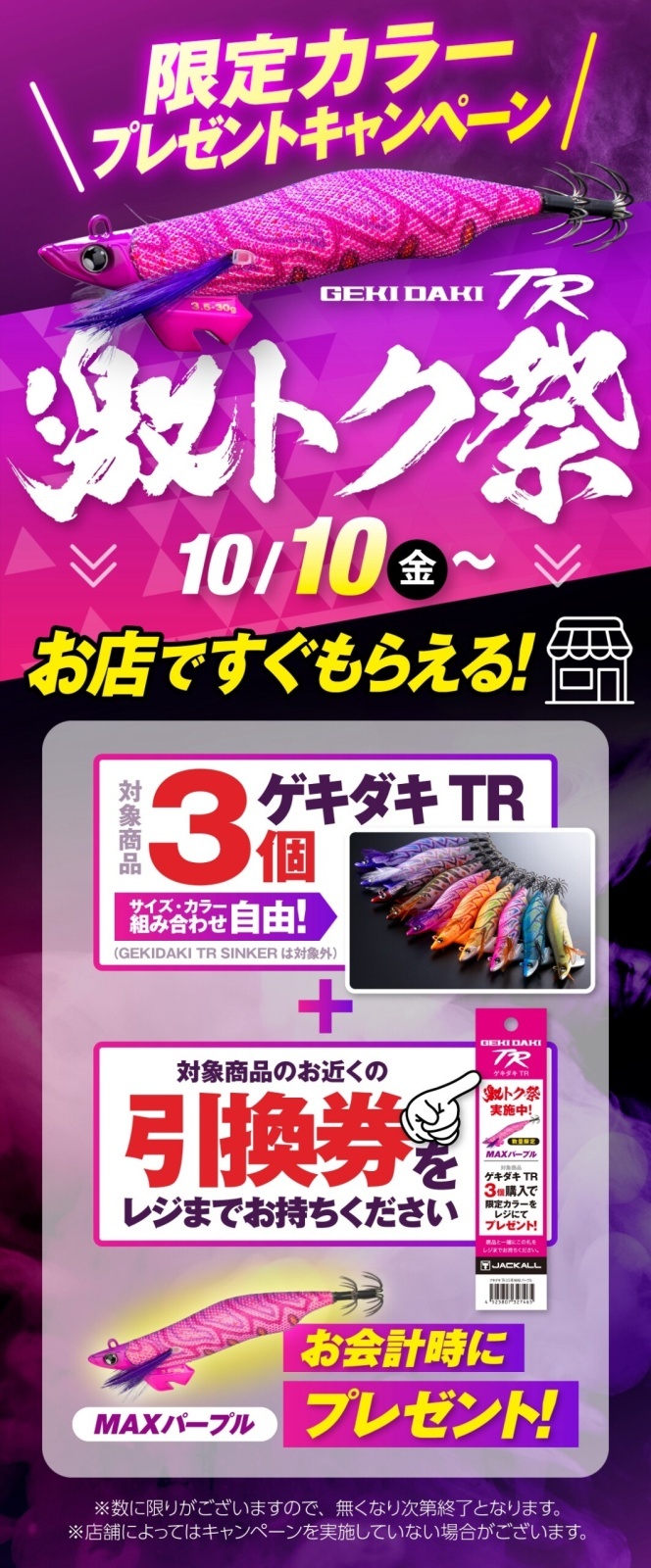 「ジャッカル ゲキダキTR」を3本ご購入毎に非売品カラー「MAXパープル3.5号」を1本もらえる激トク祭が10/10より開始です!
