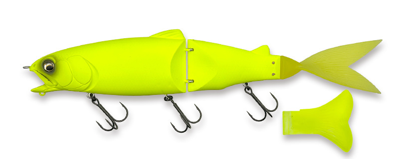 これまでのビッグベイト、ジャイアントベイトになかった広角可動ジョイントを採用。意思通りに動く360度テーブルターンや水中ドッグウォークを実現、抵抗の大きいリッジテールモードでもここぞという食わせポイントでの「逃しのダート」が可能になりました。
