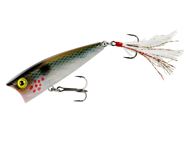 スーパーマグナムサイズのポップRが再登場!尻下がりの姿勢で浮き、かつてのP70モデルが持っていた予測不能なアクションを再現。ティンセルをミックスしたフェザーフックがアトラクター要素を高めていると共に、重低音ラトルも魚を呼び寄せる力を持っています。リアフックが#4なのに対しベリー部分に装着されたフロントフックは#2を採用、フッキング率を高めています。遠投性能にも秀でたポップRです。