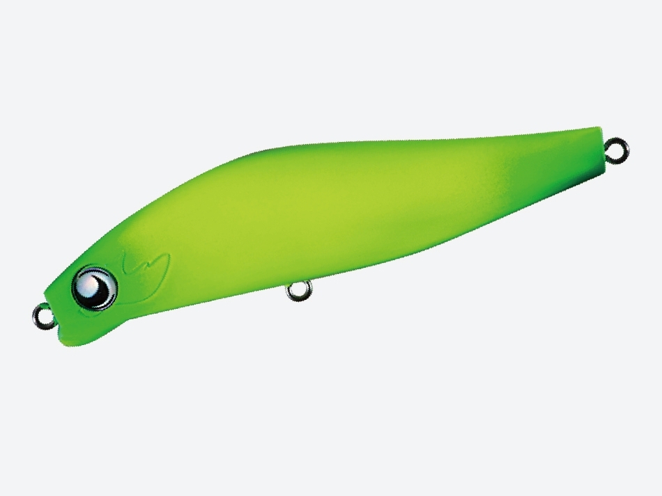 デイゲームやスレた明暗・サーチ等に絶大な効果を発揮する引き波とS字アクション。アゴ下の突起は動きには関与しないが、高速域での倒れ込み・破綻を抑制し水面での粘りを生む。