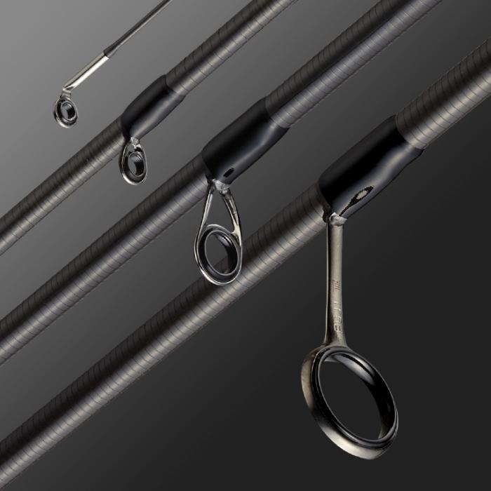 ラインに角度が付きやすいトップガイドにはリング断面形状がなだらかなためラインに急激な角度が付きにくいチタンフレームSiCリングLFガイド(T-LFSG-3)、ティップからベリーにかけてはトルザイトリングKTガイド(T-KTTG 3、3、3、3、3.5、4.5)、KTガイドと元ガイドの高低差を少なくするトルザイトリングKLガイド(T-KLTG7L)、元ガイドにはトルザイトリング ATガイド(T-ATTG16)を採用。