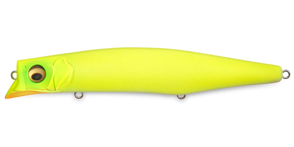 シャロー域や表層域において、ボラや落ちアユ、コノシロ等の大型ベイトが捕食される状況でボリューム感のあるハイアピールボディが絶大な効果を発揮。独自形態のリップスポイラーは、捕食レンジにシビアなモンスターを果敢に反応させるべく、このサイズで最もアジャスト率の高い最大0.8mの絶妙なフィーディングレンジを捉え、オリジナルのカゲロウよりも一段下層の攻略を可能としています。また、強化したダイビング・スタビリティによって、荒れた波風や潮流による水面からの飛び出しを完全に抑え、外洋の磯場やサーフなどラフな環境にも対応。カゲロウ MD 156Fに搭載した重心瞬間移動システムLBOII(PAT.)は、カゲロウMD 125Fと比較してウエイト本体重量を2倍以上も増加。圧倒的質量を持つベアリング内蔵ウエイトがキャスト時に強力な推進ベクトルを発生させ、従来の同サイズルアーの平均的飛距離を格段に凌駕する、超・長距離飛行を実現。リールハンドルに手を掛けた瞬間に、即座にロールアクションが立ち上がる稀代のレスポンシビリティが、圧倒的に攻撃領域を拡大。竿抜けエリアのモンスターに迫ります。