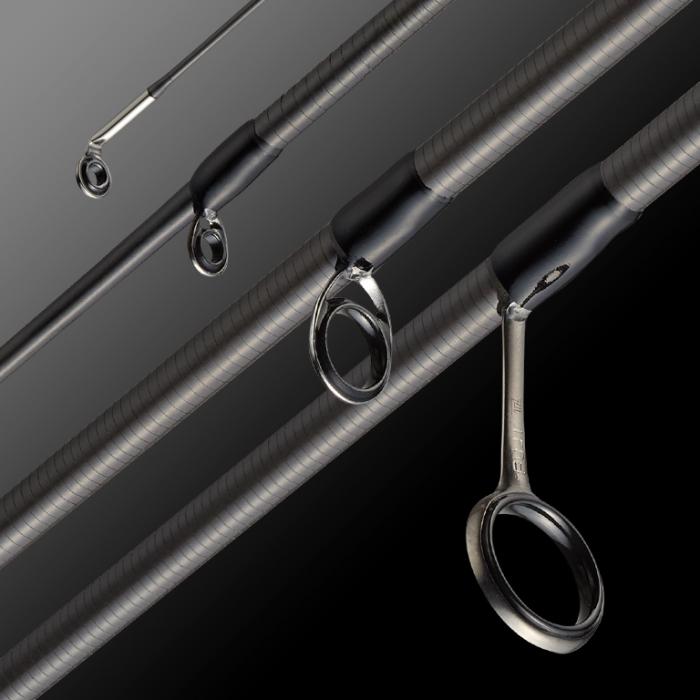 ラインに角度が付きやすいトップガイドにはリング断面形状がなだらかなためラインに急激な角度が付きにくいチタンフレームSiCリングLFガイド(T-LFSG-3)、ティップからバットにかけてはチタンフレームトルザイトリングKTガイド(T-KTTG 3、3、3.5、4.5、7)、元ガイドはチタンフレームトルザイトリング ATガイド(T-ATTG12)を採用。