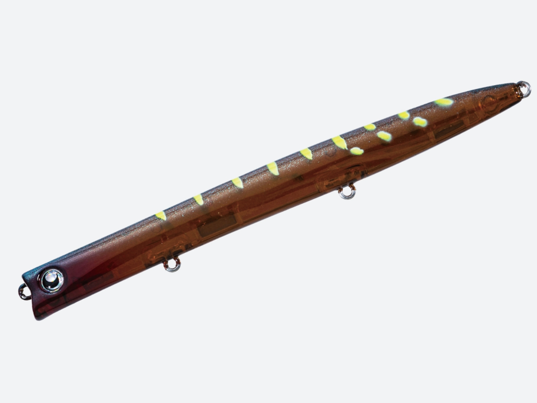 いかなる塩濃度であっても、アップ・ダウン、デッドスロー・早巻きであってもレンジ20cm前後から外れないように顔周りの角度を設計。これにより、ダウンクロスに立ち位置が限られるエリアにおいてもレンジをキープする事が可能になり攻略の幅を広げる。さらに、サヨリパターンのようなストップと早巻きを繰り返す場合でも使用可能。