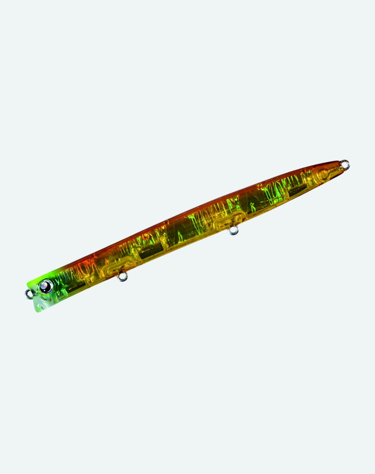 いかなる塩濃度であっても、アップ・ダウン、デッドスロー・早巻きであってもレンジ20cm前後から外れないように顔周りの角度を設計。これにより、ダウンクロスに立ち位置が限られるエリアにおいてもレンジをキープする事が可能になり攻略の幅を広げる。さらに、サヨリパターンのようなストップと早巻きを繰り返す場合でも使用可能。