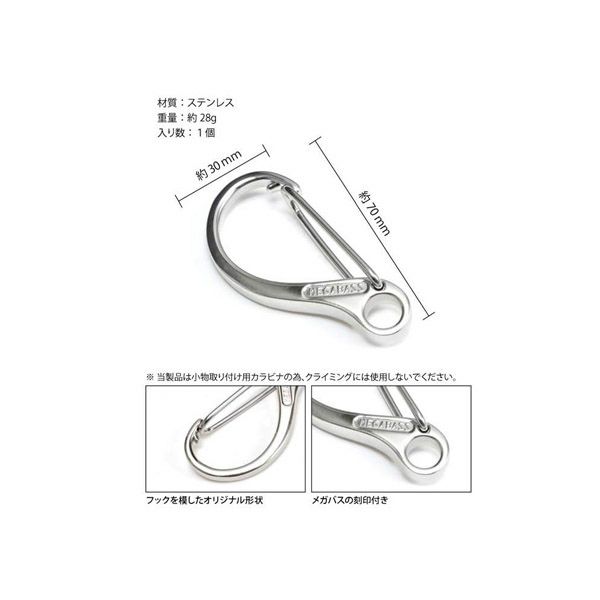 車のカギやフィッシュグリップなどのツールの取り付けに便利なメガバスオリジナルカラビナ。