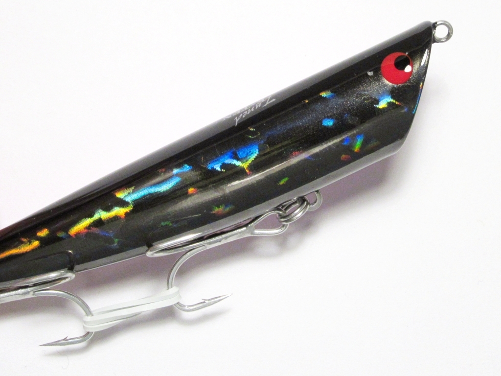 わずかにヘッド先端を沈める浮き姿勢は水面直下のミノーアクションを重視したため。セルフスイムコントロールと名付けたアクションは、静水時に、海面上でのアクションとミノー状態との比率を1:9に設定。波立つにつれ海面に顔を出す比率を上げ、必要に応じたアピール力を発揮するというもの。ステディリトリーブ時のこの特性を前提に、アングラー側からの操作をプラスすることで、トップで釣れる状況の拡大を狙いました。
