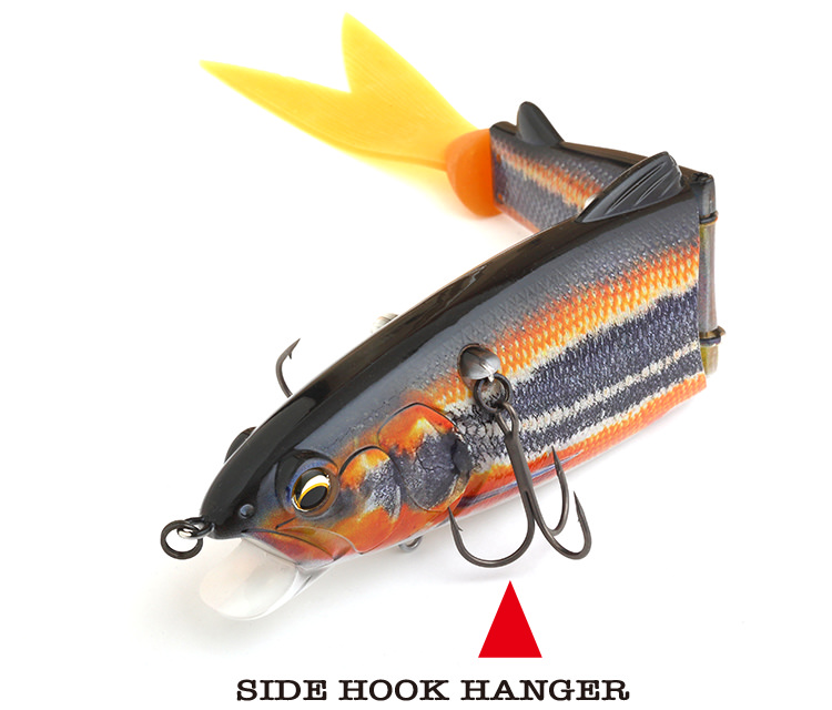 サイドフックハンガーはボディ側面にあることで、ボディに溶け込みバスがフックの存在を意識しにくくなります。またフリー状態で吊るされているので口腔内に吸い込まれやすく、威嚇バイトも高確率でガッチリフッキングします。さらに装着位置はバスがもっとも攻撃的に狙う頭部やや後ろに設置しています。